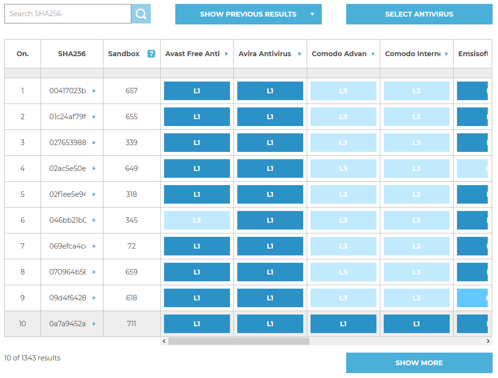 We share checksums of malicious software for researchers and security enthusiasts by dividing them into protection technologies that have contributed to detect and stop a threat. According to independent experts, this type of innovative approach of comparing security will contribute to better understand differences between products available on the market.
