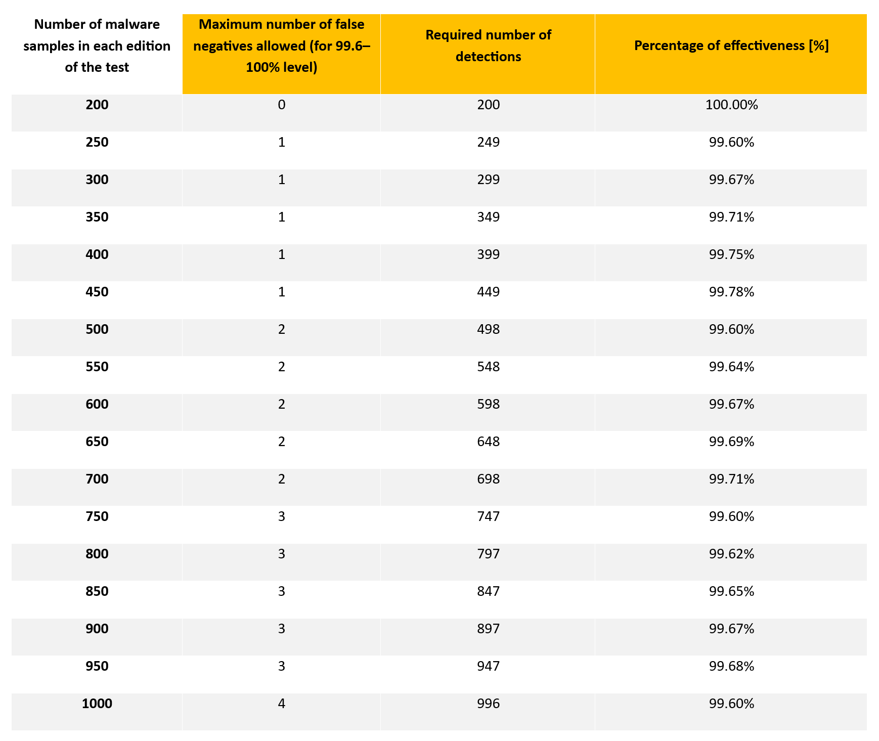 From 2026, the 99.6% threshold will be the minimum level of effectiveness required to obtain EXCELLENT certification in the Advanced-In-The-Wild Malware Test. This is a stable and statistically justified value that allows for a reliable and fair assessment of products in the highest effectiveness class.