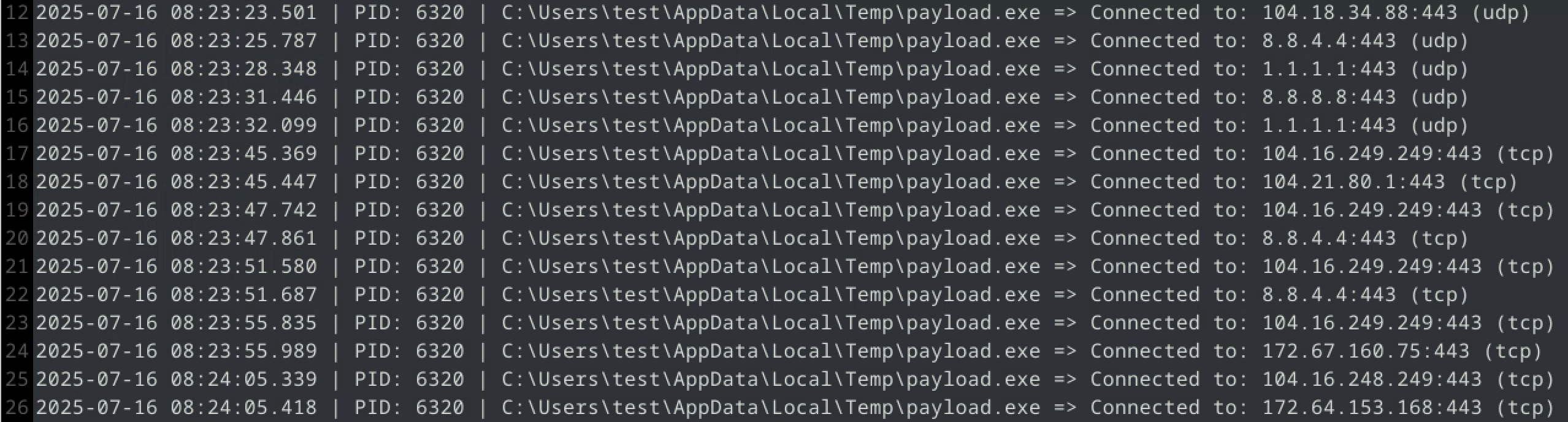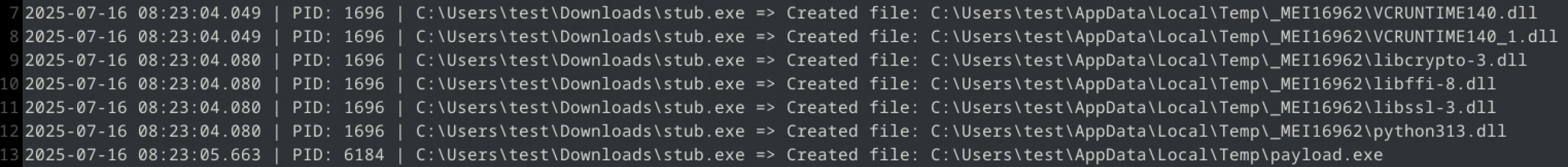 Powyżej jeden z przykładów złośliwego oprogramowania w naszym teście, które zapisywało pliki w folderze TEMP, aby zainicjować złośliwą aktywność w systemie.
