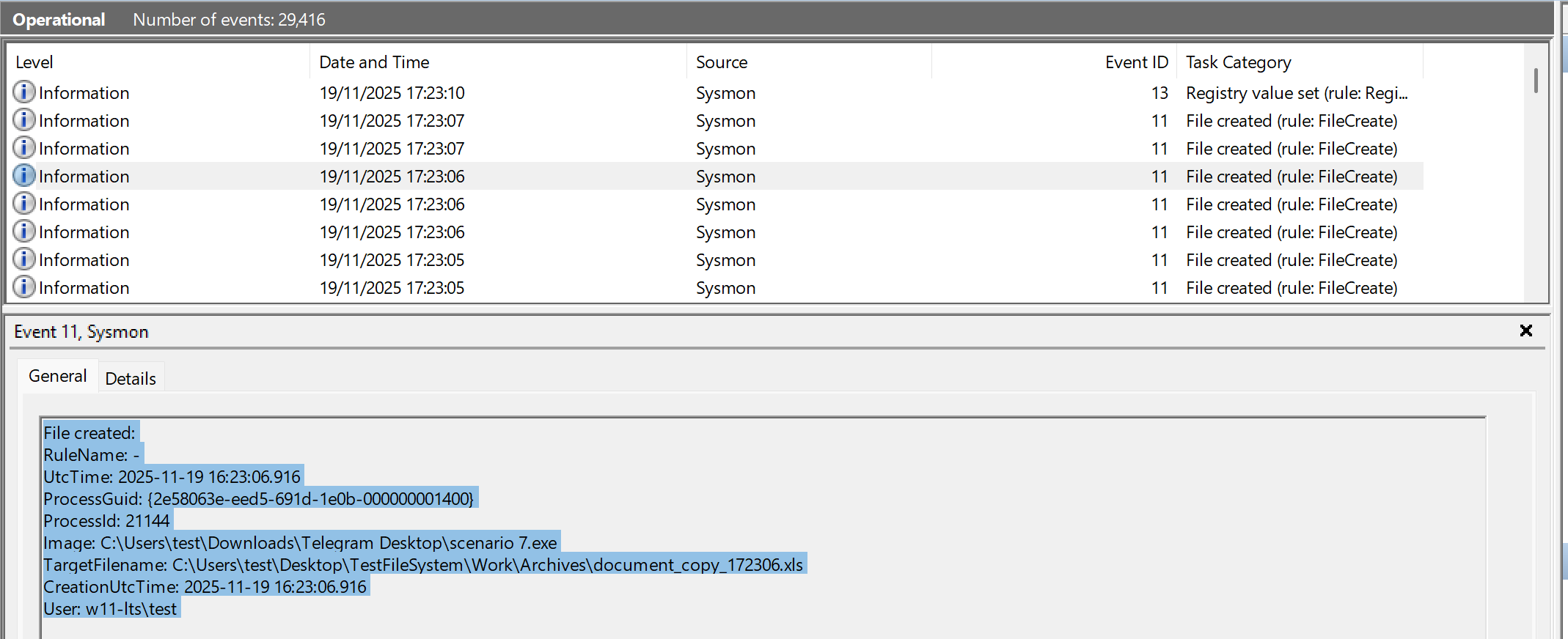 Poniżej przykład utworzenia pliku Excel przez testowe malware scenario7.exe. Widzimy dokładnie, co się wydarzyło: kiedy, przez jaki proces, z jakim ProcessID, jaką ścieżką wykonania (Image), jaki plik został utworzony (TargetFilename) oraz przez którego użytkownika: